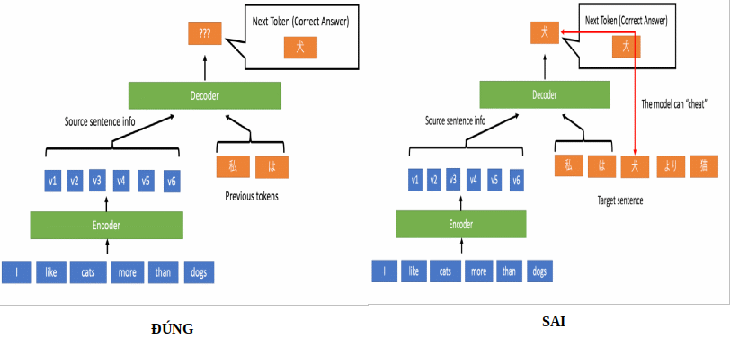) Do đó phải che (mask) bớt một phần token ở decoder hidden state sau trong quá trình decode.