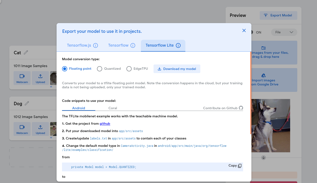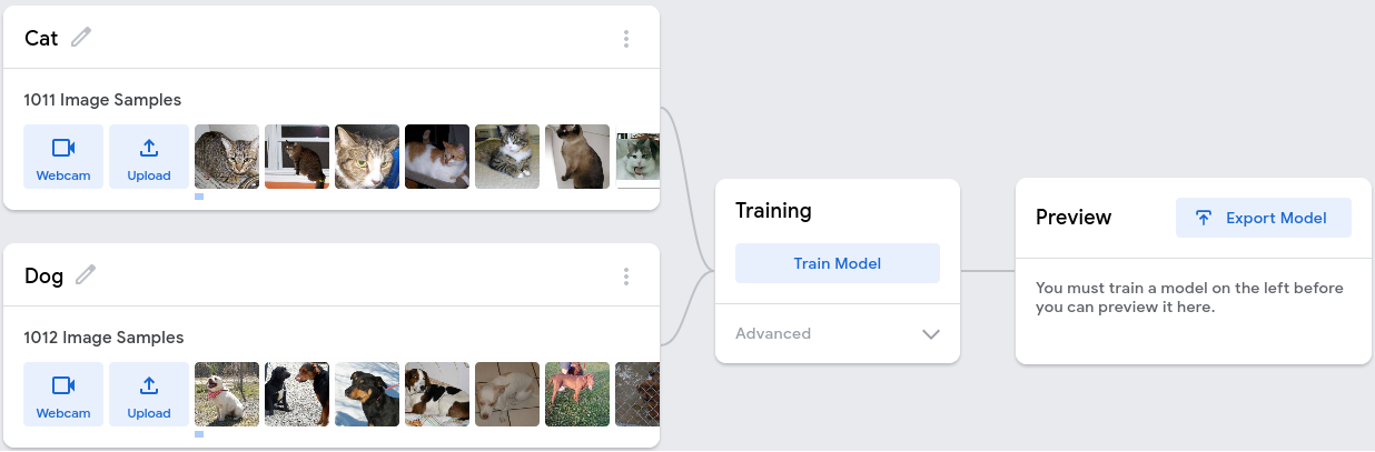 Để có thể lấy được data mình tải từ trang này về : https://www.kaggle.com/tongpython/cat-and-dog/data , sau đó upload vào model ở trên với từng loại mà bạn thiết lập và nhấp vào Train model để máy tiến hành học.
