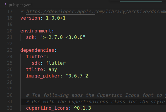 Thêm vào 2 thư viện image_picker và tflite vào thư mục pupspec.yaml
