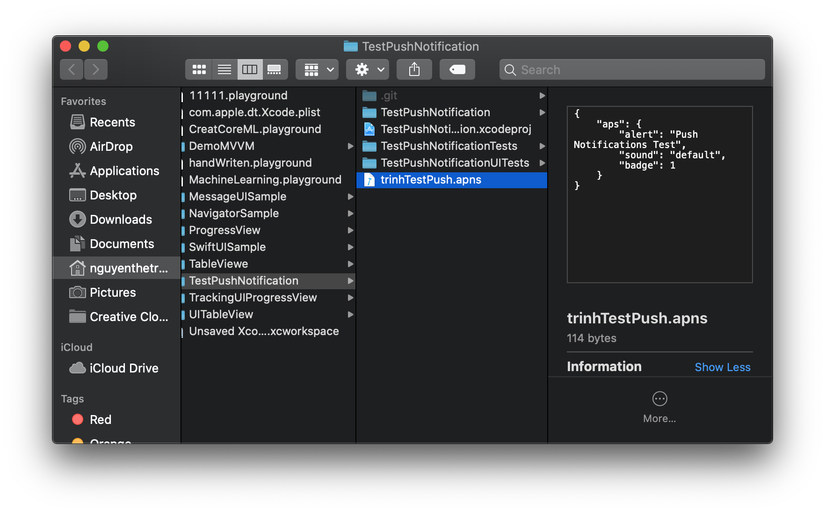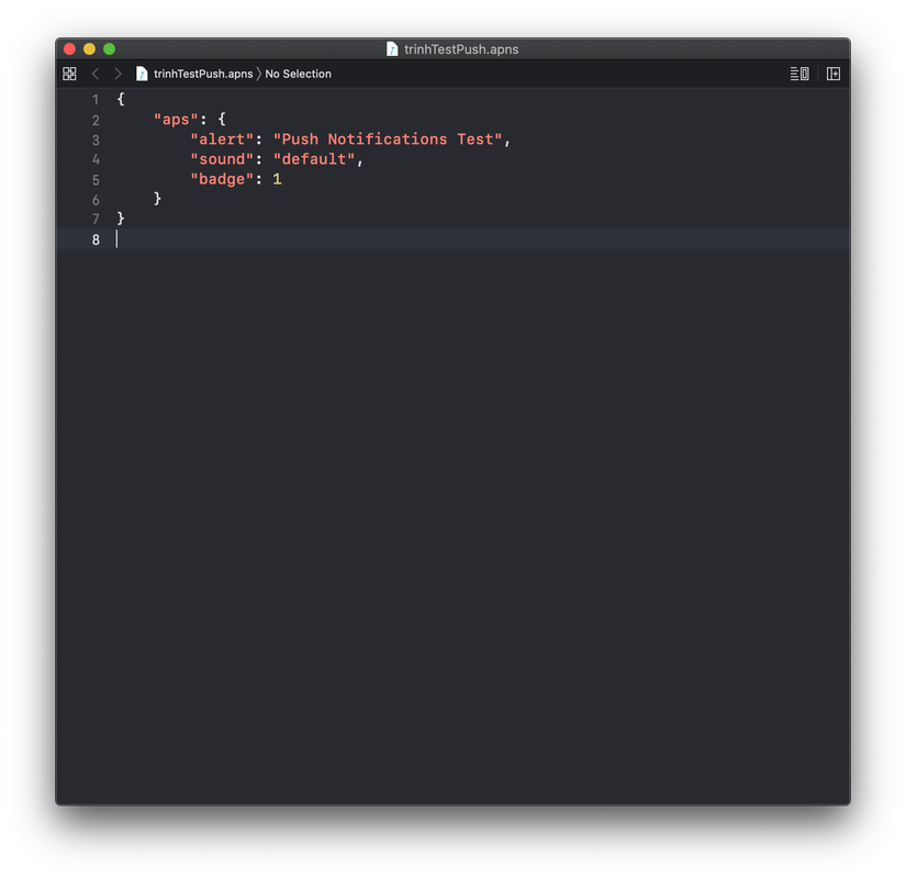 Chúng ta cần phải tạo 1 file có đuôi là .apns. Đây chính là file tượng trưng cho JSON mà app sẽ nhận về từ notifcation, chúng ta phải viết đúng format JSON mà apple quy định.