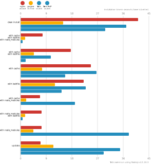 - clear install: Mất bao lâu để chạy một bản cài đặt hoàn toàn mới: không có file lock, không có package nào trong cache, không có thư mục node_modules