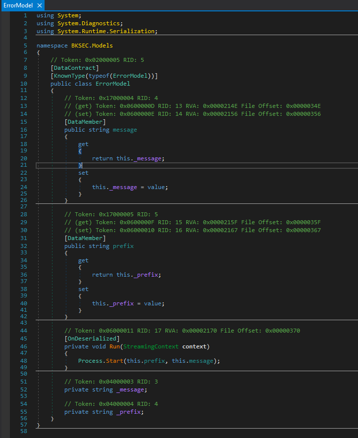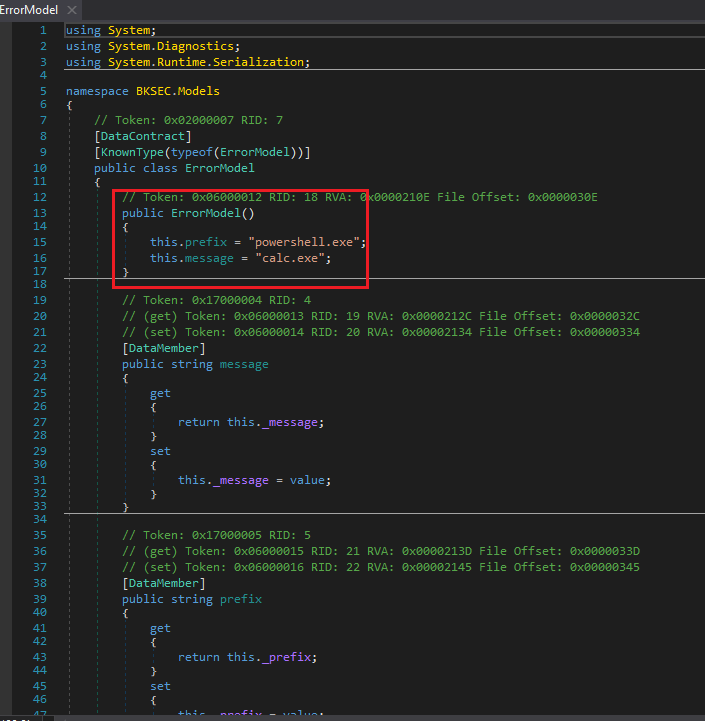 Để ý method Run trong class BKSEC.Models.ErrorModel. Nếu chúng ta control được prefix và message thì chúng ta hoàn toàn có thể RCE server nếu bằng cách nào đó chúng ta chạy được Run() lên. Ví dụ prefix = poweshell.exe và message = calc.exe thì khi chúng ta thành công màn hình calculator sẽ được bật lên. Rõ ràng đây là sink của chúng ta, và để ý class này có dòng [KnownType(typeof(ErrorModel))] thỏa mãn điều kiện thứ 3 của chúng ta, các property đều có thuộc tính DataMember. Xác định được sink rồi vậy chúng ta phải xây dựng payload như thế nào và truyền vào đâu.