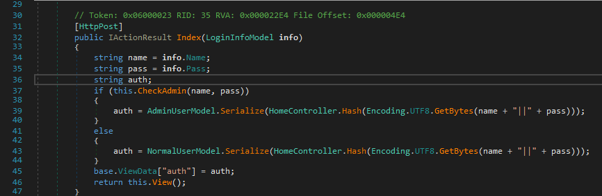 Bên trong class HomeController có đoạn code trên. Rõ ràng là nếu ta thỏa mãn điều kiện để pass qua hàm CheckAdmin thì sẽ thực thi đoạn code auth = AdminUserModel.Serialize(HomeController.Hash(Encoding.UTF8.GetBytes(name + "||" + pass)));. Nhảy vào AdminUserModel.Serialize thì thấy code sẽ đọc file flag.txt và trả về cho chúng ta flag