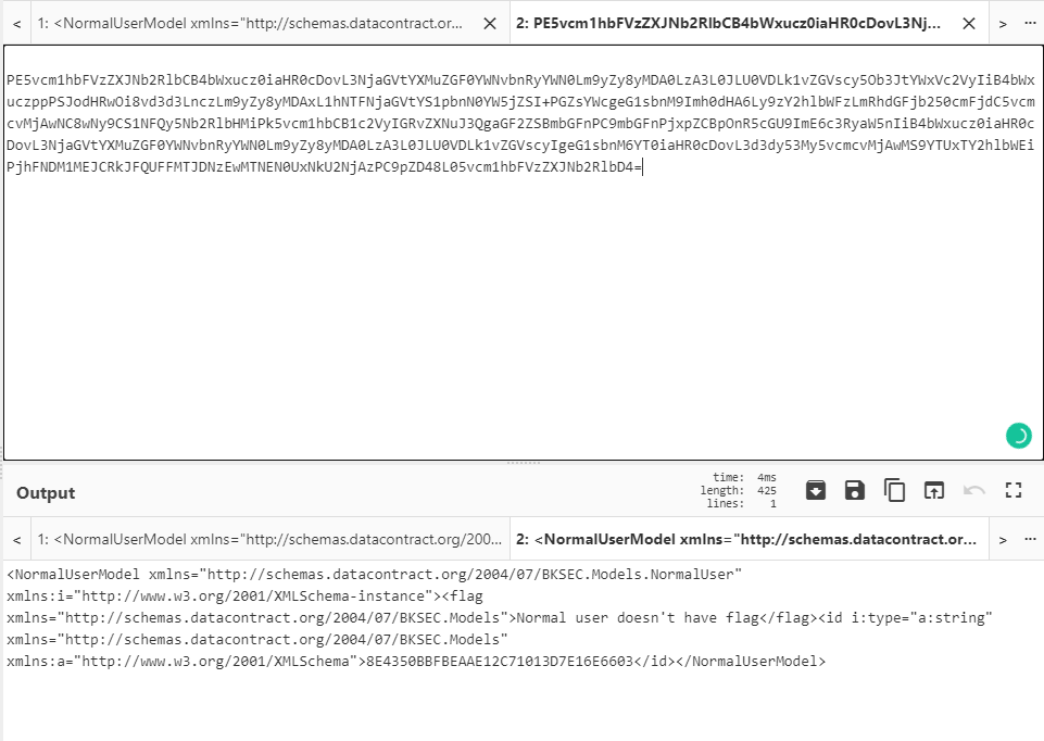 Sau khi giải mã thì được một chuỗi XML như trên. Với thông tin bây giờ khi chưa đọc code thì ta chưa biết nó có tác dụng gì. Tuy nhiên thì ta thấy được Normal user doesn't have flag nên có thể rằng khi ta truy cập được vào admin thì sẽ bật ra flag.