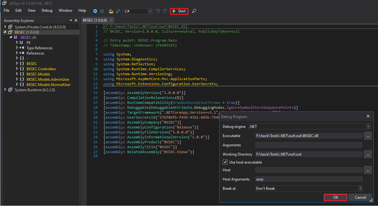 Trong thư mục source code các bạn tải vể sẽ có một file là BKSEC.exe. và BKSEC.dll để thuận tiện cho việc debug. Mình sẽ load file dll vào DnSpy và khởi chạy nó lên như sau: