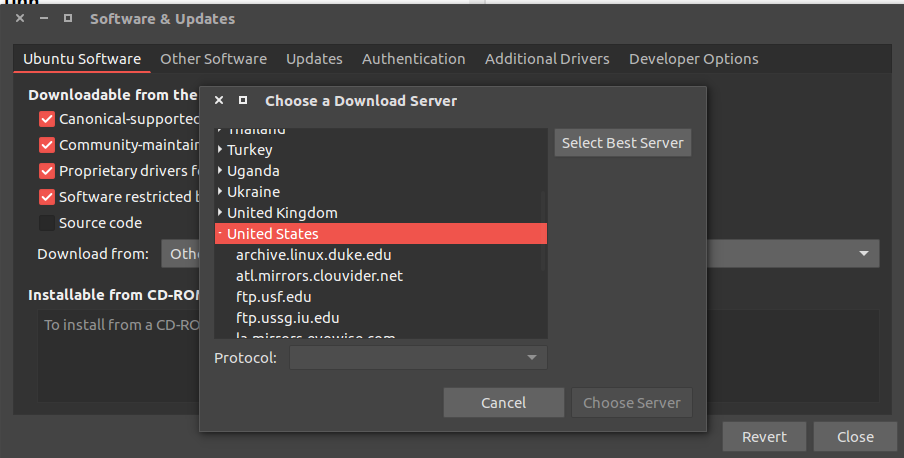 Ở mục download from chọn server for Viet Nam. Hoặc click vào tùy chọn sổ xuống, chọn other, nhấn Select best Server để hệ điều hành tự chọn cho bạn 1 server tốt nhất để tải bản cập nhập. Rồi nhấn choose server để lưu lại thôi