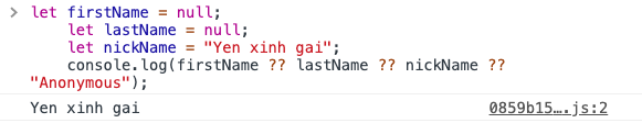 console.log(firstName ?? lastName ?? nickName ?? "Anonymous"); // nếu firstName null hoặc undefine thì lấy lastName. nếu lastName null thì chọn nickname nấu nickName null thì là 'Anonymous' ở đây first và last đều null nên kết quả sẽ là Yen xinh gai