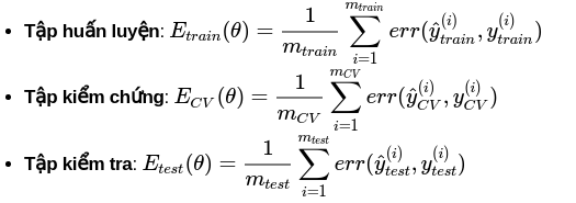 Như vậy, khi dữ liệu của ta sẽ được phân chia làm 3 phần là tập huấn luyện (training set), tập kiểm chứng (cross validation set) và tập kiểm tra (test set). Ứng với mỗi phần ta sẽ đưa ra thông số lỗi tương ứng: