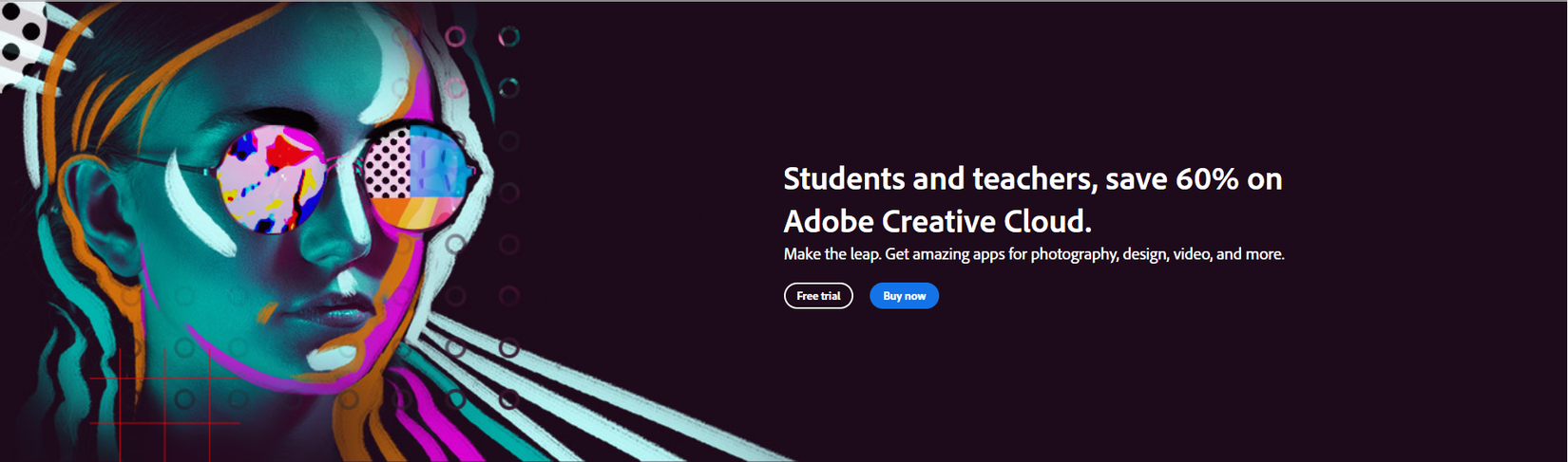 Adobe là một hệ sinh thái cực lớn dành cho việc thiết kế, với các công cụ thiết kế (Illustrator), chỉnh sửa ảnh (Photoshop), chỉnh sửa video (Premiere, After Effects) và còn nhiều hơn thế. Gói ưu đãi dành cho sinh viên giảm đến 60%, từ 69,72$/th. xuống còn 26,30$/th. trong năm đầu tiên và 39,46$/th. trong những tháng tiếp theo. Việc đăng ký sẽ yêu cầu bạn chứng minh rằng bạn là sinh viên bằng cách yêu cầu upload thẻ sinh viên.