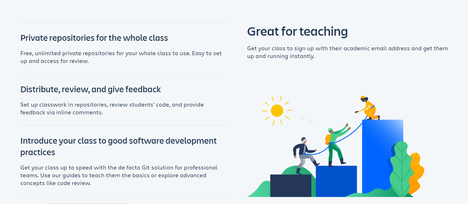 Bitbucket hỗ trợ tạo Repositories riêng cho nhóm/lớp học, công cụ phân phối, review và đưa ra phản hồi. Hỗ trợ thêm không giới hạn các cộng tác viên thay vì 5 như tài khoản miễn phí. Chỉ cần đăng ký với địa chỉ email edu là bạn sẽ được tự động cấp academic-license.