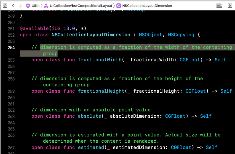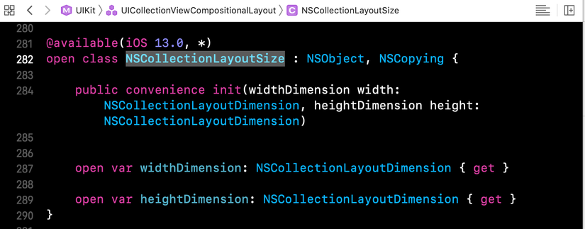 Chúng ta dùng NSCollectionLayoutSize để setup chiều rộng và chiều cao của Item in Layout.Nó dùng 2 biến widthDimension và heightDimension để setup trong quá trình init.