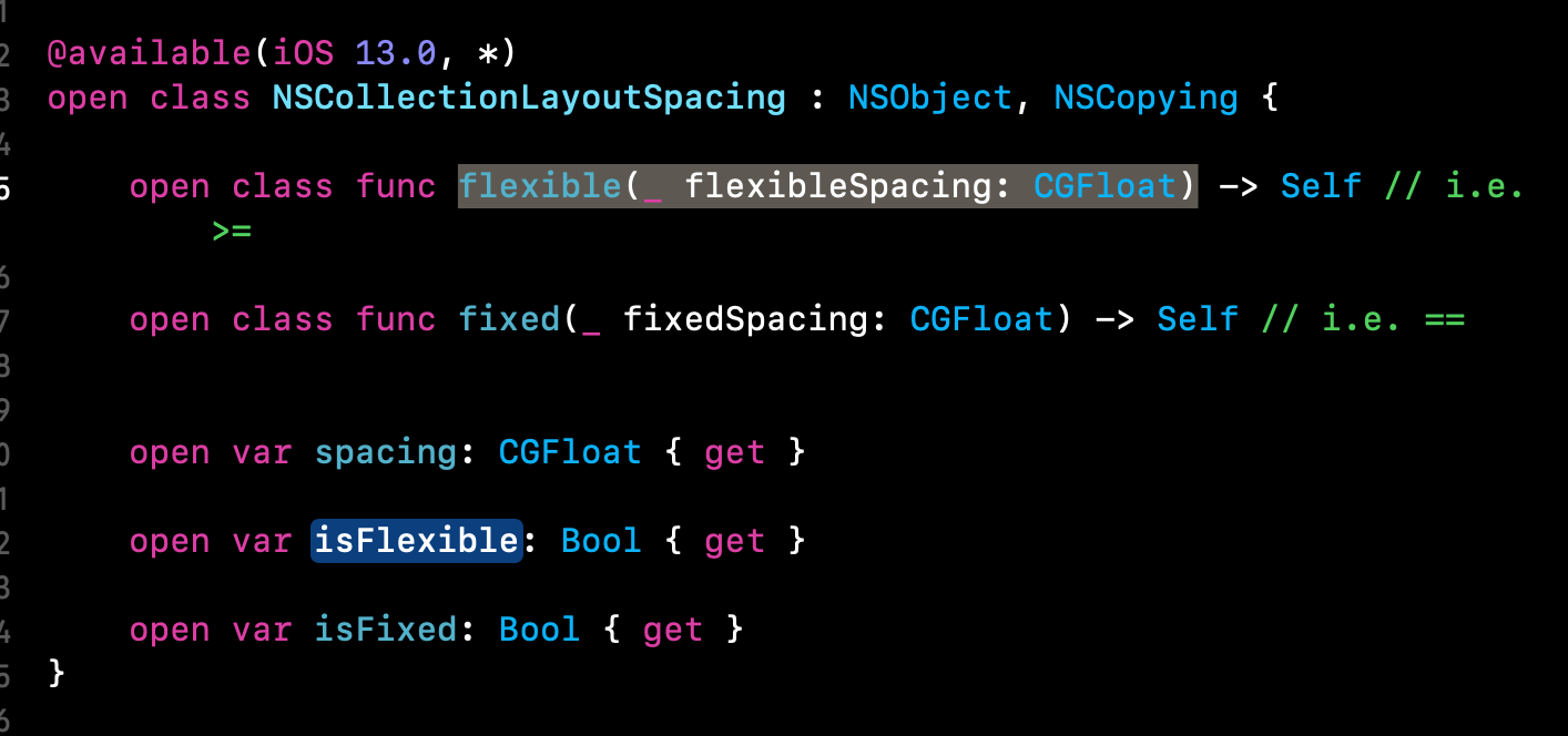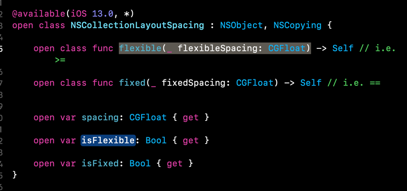 Ngoài ra biến edgeSpacing có kiểu NSCollectionLayoutEdgeSpacing. Trong class NSCollectionLayoutEdgeSpacing có có 2 property:
