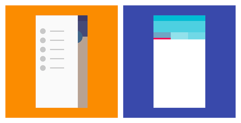 Ngăn kéo điều hướng là một menu trượt từ trái hoặc phải bằng cách nhấn biểu tượng menu hamburger. Các tab được đặt ngay bên dưới tiêu đề màn hình và cho phép tổ chức nội dung ở mức cao, cho phép người dùng chuyển đổi giữa các chế độ xem, bộ dữ liệu và các khía cạnh chức năng của ứng dụng.