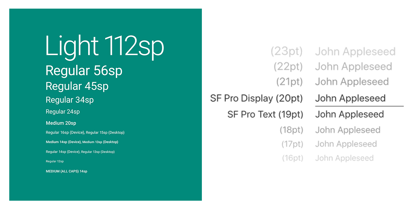 San Francisco là kiểu chữ hệ thống trong iOS. Roboto là kiểu chữ tiêu chuẩn trong Android. Noto là kiểu chữ tiêu chuẩn cho tất cả các ngôn ngữ trong Chrome và Android do Roboto hỗ trợ. Bạn cần phải chú ý đến các quy ước về kiểu chữ và bố cục của mỗi nền tảng.