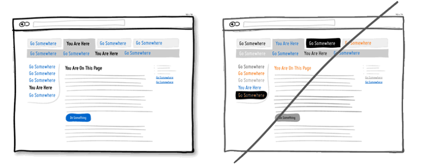 Giao diện trực quan như màu sắc, chiều sâu và độ tương phản là những dấu hiệu giúp người dùng hiểu được hệ thống ký hiệu cơ bản trong giao diện của bạn. Để truyền đạt rõ ràng điều này với người dùng, thì bạn phải phân biệt rạch ròi giữa hành động trỏ chuột (dành cho các links, các nút bấm), các thành phần được chọn (như là các mục đã chọn) và những dòng text đơn giản, rồi sau đó áp dụng thống nhất trên một giao diện