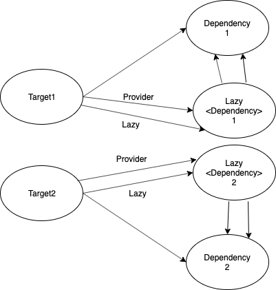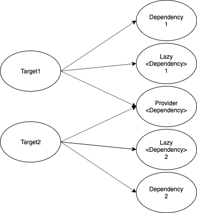 Từ sơ đồ trên, ta có thể thấy được mỗi target sẽ được tạo ra cho nó Dependency và Lazy. Tuy nhiên Provider là cùng một chia sẻ trên Target.