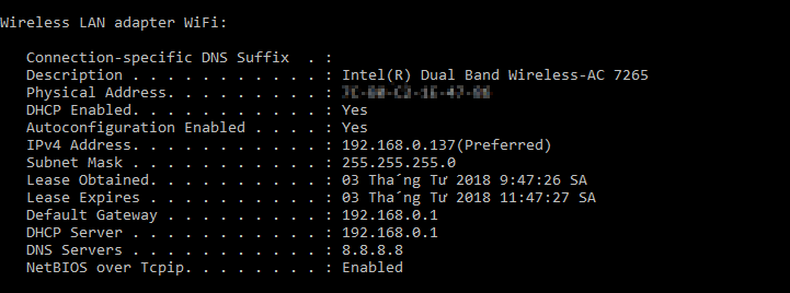 Cách dùng lệnh ipconfig /all: hiển thị các thông tin của máy tính đang kiểm tra gồm tên host, địa chỉ IP, DNS,...