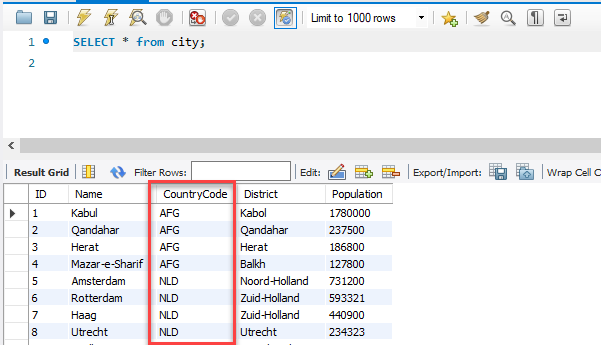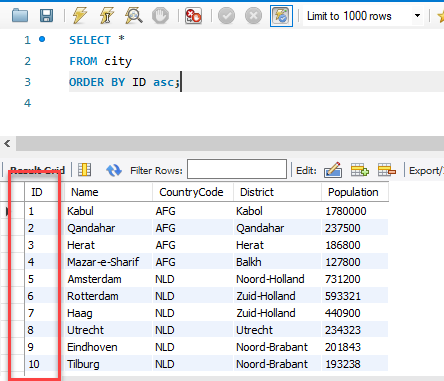 Ví dụ: Ở ví dụ dành cho Order by mình sẽ lấy lại bảng City khi dùng cho lệnh Group by để các bạn có thể dễ dàng theo dõi hơn. Bây giờ mình muốn sắp xếp tên các thành phố theo thứ tự tăng dần (ASC) của ID mình sẽ thực hiện câu lệnh như sau: