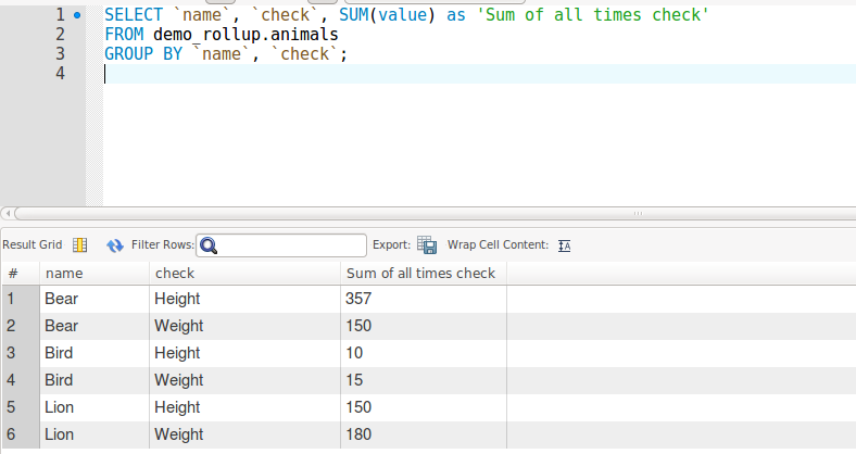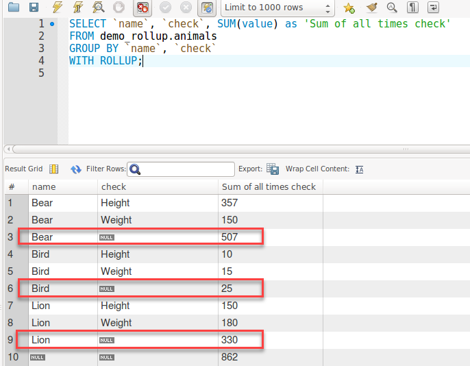 Như các bạn đã thấy, chúng ta đã lấy được tổng chiều cao và cân nặng của từng động cho tất cả các lần check. Nhưng ở đây nếu chúng ta muốn lấy thêm tổng của cả chiều cao và cân nặng thì phải làm sao? Roll up sẽ giúp chúng ta điều này, bạn chỉ cần thêm câu lệnh như sau:
