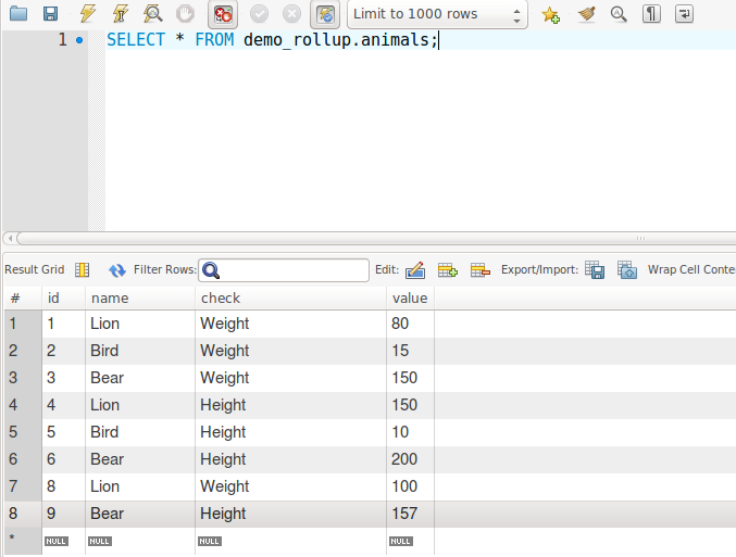 Mình có 1 bảng động vật (animals), với trường check là số lần kiểm tra chiều cao (height), cân nặng (weight) của mỗi động vật, tương ứng với mỗi trường là giá trị của mỗi lần đo (value)