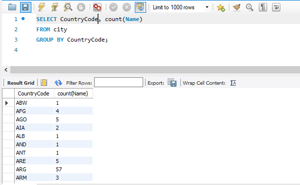 và mình muốn đếm ứng với mỗi CountryCode sẽ có bao nhiêu người thì mình sẽ đếm theo Name. Mình sẽ thực hiện câu lệnh như sau: