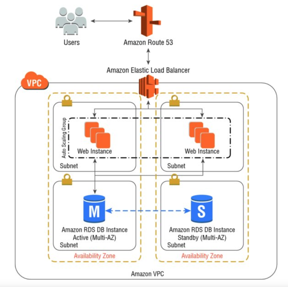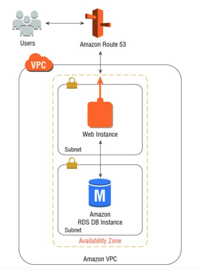 Hãy cùng xem một ứng dụng web đơn giản dưới đây, ứng dụng chỉ bao gồm 1 web instance được kết nối với database RDS