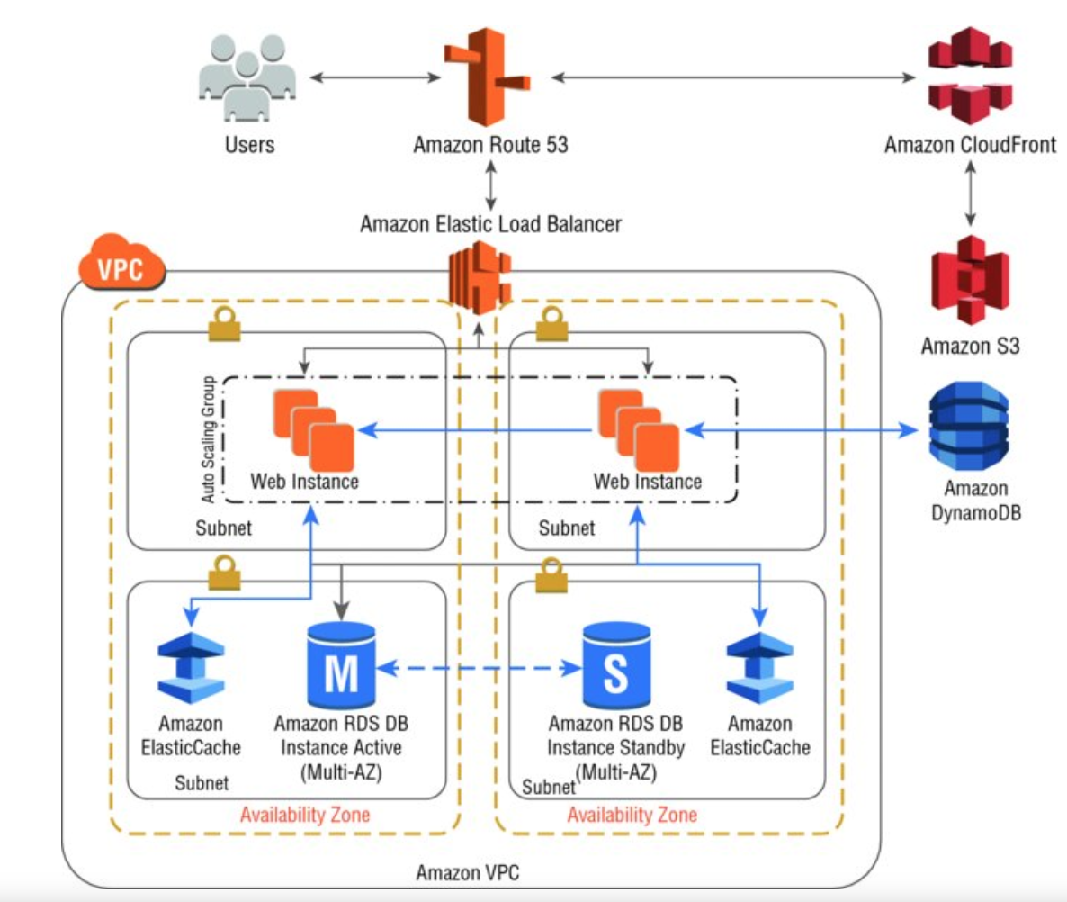 Thử tối ưu lại mô hình ban đầu, sử dụng các dịch vụ lưu trữ của AWS. Lưu trữ các file ảnh, videos, CSS và Javascript lên S3 sau đó phân phối dữ liệu bằng CloudFront. Bằng cách này chúng ta sẽ giảm tải cho web instance cũng như tăng tốc độ load nội dung thông qua CDN.