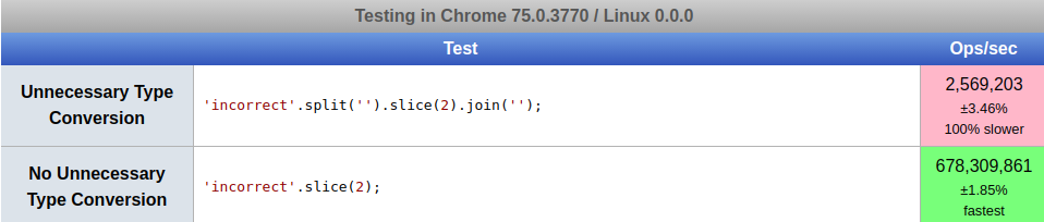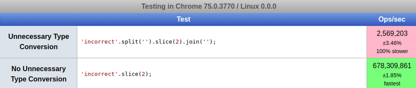 Ở đây kết quả cuối cùng muốn đưa ra là 'correct'. Cách 1 chuyển chuỗi 'incorrect' thành mảng sau đó cắt bỏ 2 kí tự đầu tiên rồi lại chuyển thành chuỗi. Trong khi đó cách 2 chỉ cần cắt bỏ 2 kí tự đầu tiên => loại bỏ các bước rườm rà. So sánh hiệu năng 2 dòng code trên tại đây