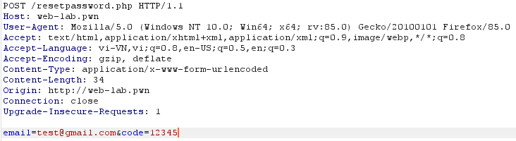 Trên đây là đoạn request reset password gồm email và code, có thể thấy đoạn code chỉ có 4 số và dường như lập trình viên đã không giới hạn số lần sai code. Vậy chỉ cần tối đa 9000 request để có thể brute force thành công được code của nạn nhân:
