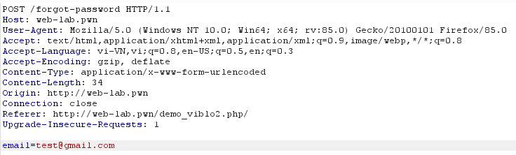 Đây là request để thực hiện việc đặt lại mật khâu. Trông có vẻ hoàn toàn bình thường, thế nhưng có một điều đáng chú ý là lập trình viên lại sử dụng một biến global $SERVER['HTTPHOST'] trong đường link được gửi cho người dùng. Vậy nên hacker có thể sử dụng một số kỹ thuật để inject host header dẫn đến đường link được gửi đến người dùng hoàn toàn không đúng, có thể dẫn đến link token.