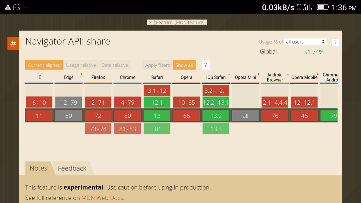 Hãy nói rằng chúng tôi muốn biết trình duyệt nào và phiên bản của chúng sẽ hỗ trợ API chia sẻ web: navigator.share (...)