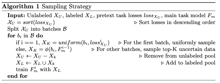 Bước 4: thực hiện lấy mẫu đều(uniform sampling) b (budget, ví dụ như 1000 với CIFAR10) mẫu dữ liệu trong batch 1 để gán nhãn. Sử dụng dữ liệu đã gán nhãn để huấn luyện mô hình main task.