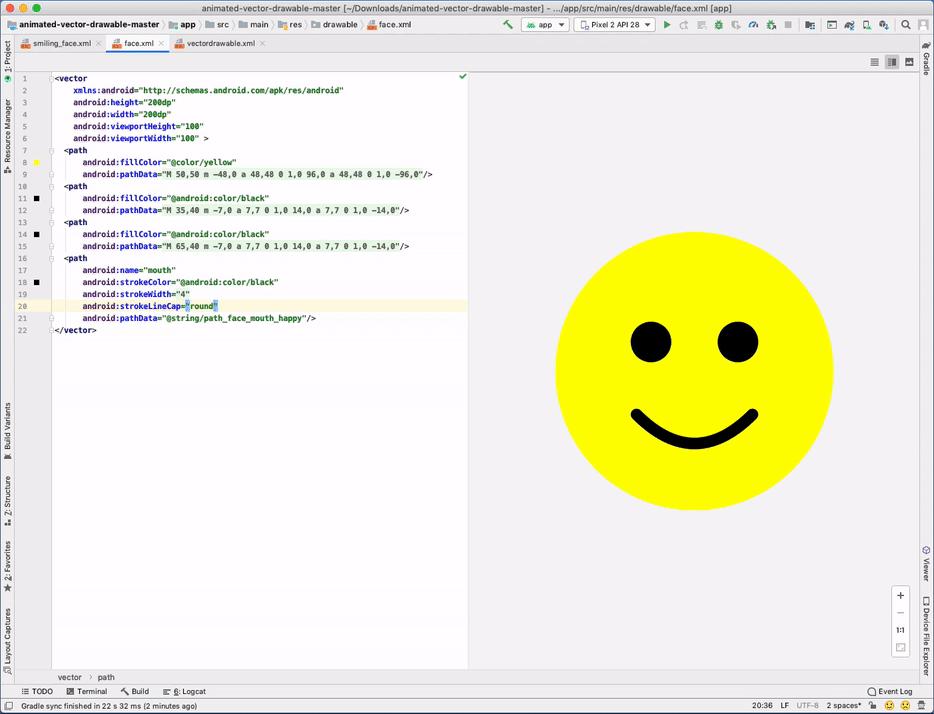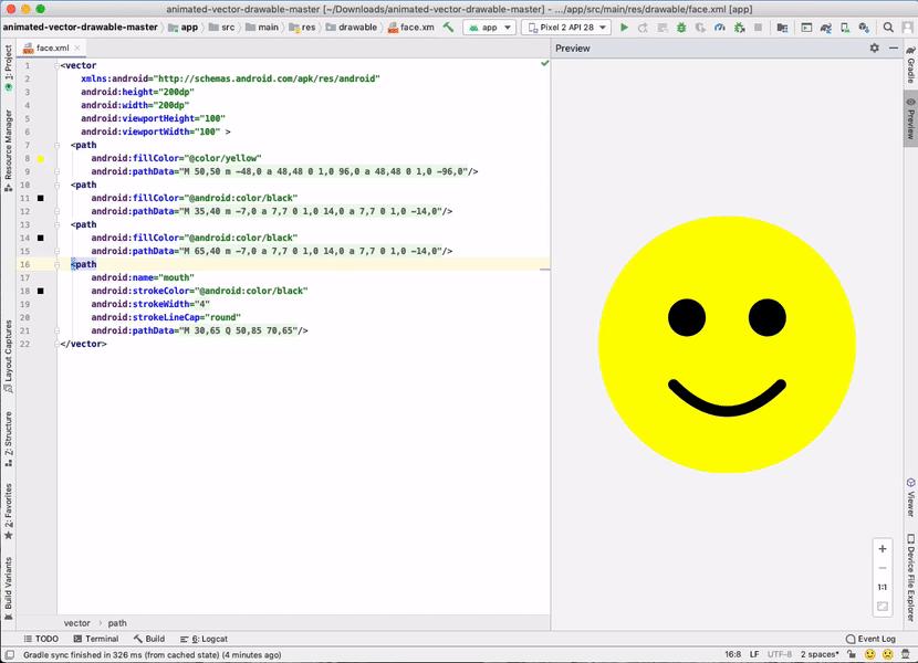 Trước đây, bạn chỉ có thể mở các drawable bằng trình soạn thảo XML, nơi sẽ cung cấp tùy chọn xem trước drawable bằng cửa sổ Preview. Hình 8 và Hình 9 cho thấy một ví dụ về việc xác minh vector drawable path một cách chi tiết trước và sau khi Android Studio giới thiệu các thay đổi UX cho trình soạn thảo thiết kế, tương ứng.