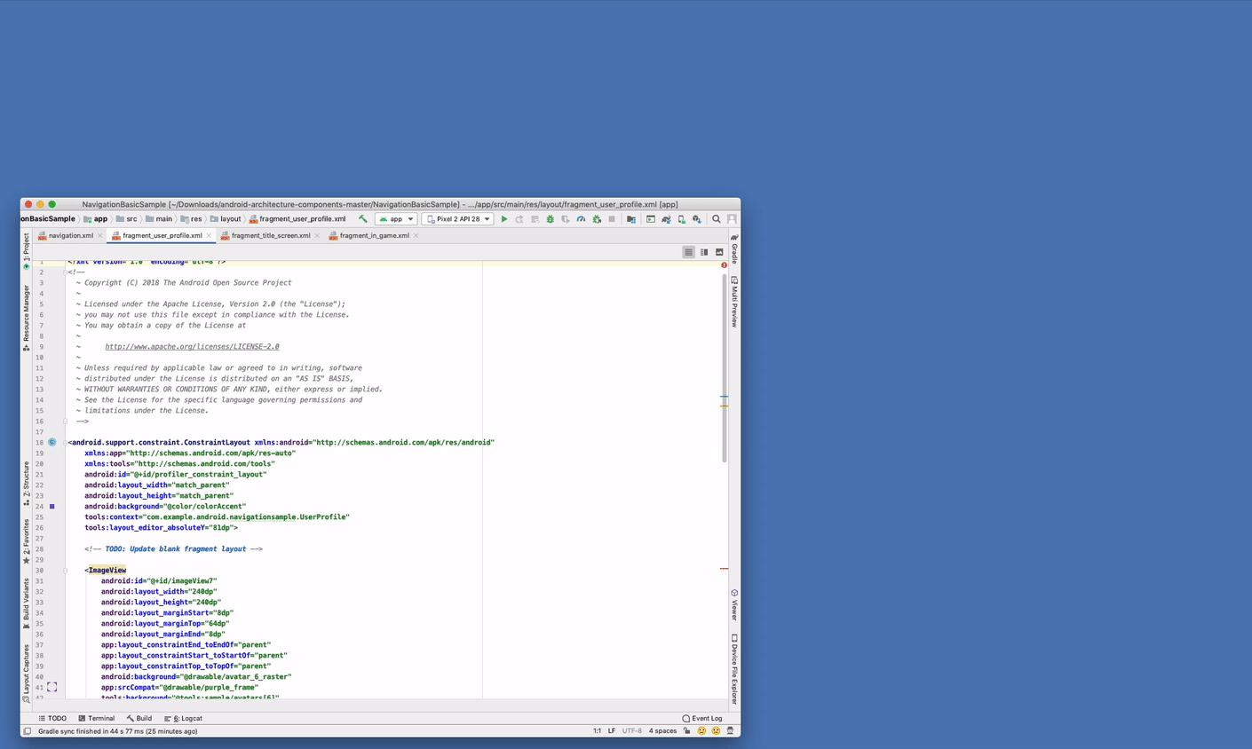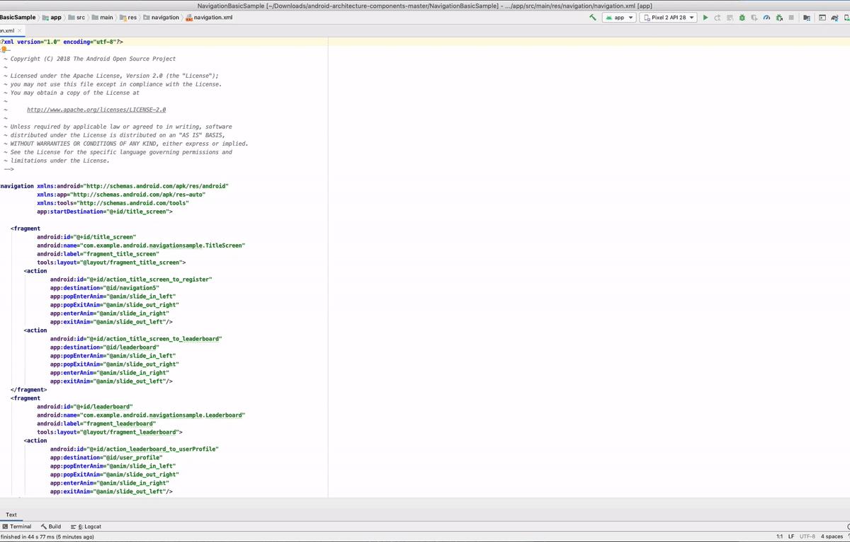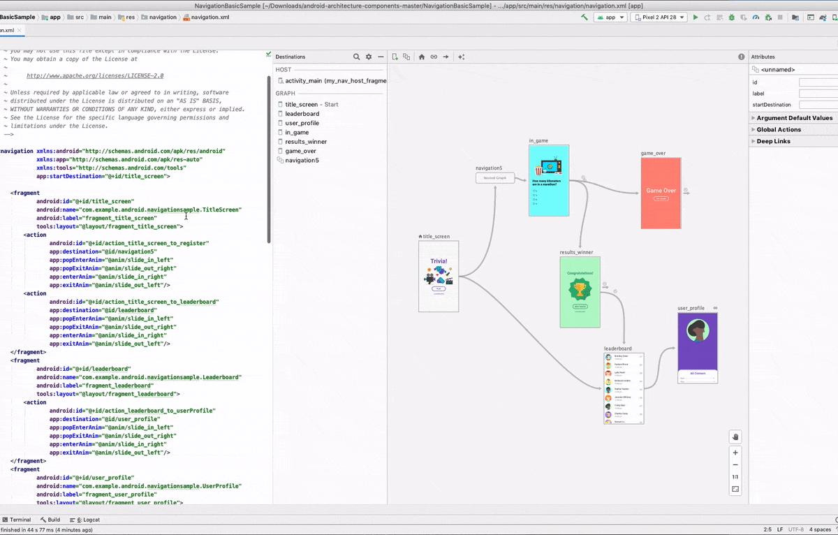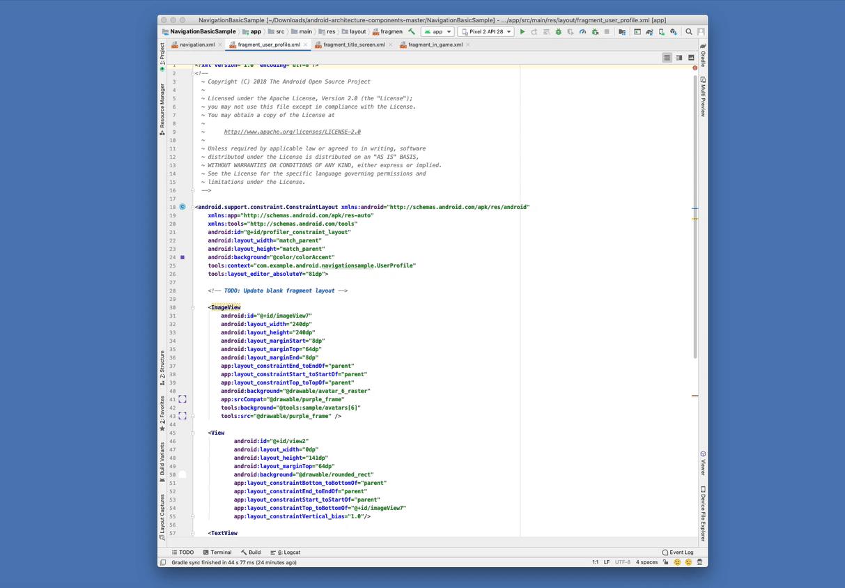 Ngoài các thay đổi ở trên, Android Studio 3.6 còn được cải thiện hỗ trợ xem trước cho nhiều loại tệp tài nguyên hơn. Như, chúng ta có thể mở các file "navigation graph" trong chế độ Split chỉnh sửa các tệp này trong khi đồng thời xem trước kết quả trong Navigation Editor. Điều này đặc biệt hữu ích cho các đồ thị (graph) lớn và phức tạp. Ví dụ, nếu bạn có nhiều lớp biểu đồ lồng nhau, bạn có thể cần phải chuyển đổi giữa các trình soạn thảo "Design" và "Text" một vài lần để khớp một đoạn cụ thể trong code của bạn với phần đồ họa tương ứng của nó, như được minh họa trong Hình 6. Bây giờ bạn chỉ cần nhấp vào thẻ <Fragment > trên phần XML để hiển thị fragment trong phần đồ họa, ngay cả khi nó nằm trong biểu đồ lồng nhau, như trong Hình 7. Tương tự, bạn có thể dễ dàng tìm thấy các phần tử trong một navigation graphs lớn bằng cách chọn thành phần quan tâm trong phần đồ họa của trình soạn thảo. Con trỏ văn bản sẽ nhảy đến thẻ XML tương ứng.