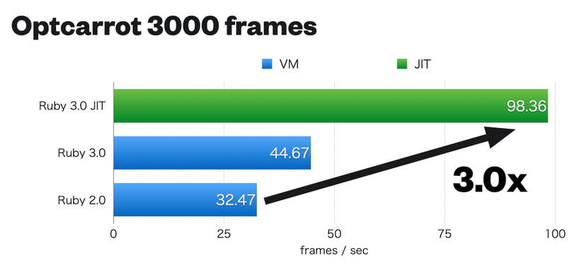 Một trong những bản cập nhật để hứa hẹn nhất cho hiệu suất của CPU Ruby . Ruby đã tối ưu hóa trình biên dịch JIT (Just In Time) từ các phiên bản trước. Trình biên dịch Ruby MJIT lần đầu tiên được giới thiệu trong Ruby 2.6. Ruby 3 MJIT đi kèm với bảo mật tốt hơn và dường như cải thiện hiệu suất của ứng dụng web ở mức độ cao hơn.