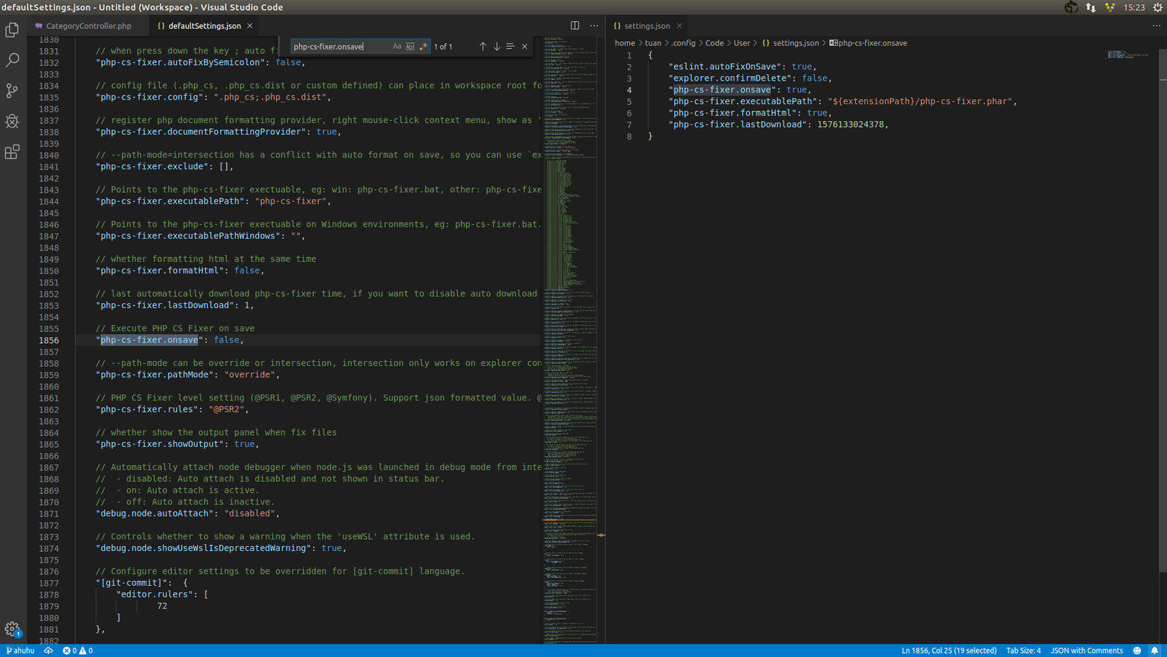 "php-cs-fixer.onsave": true: tự động chỉnh code cho đúng convention khi save"php-cs-fixer.formatHtml": true: tùy chọn tự động format code html- ... vân vân và mây mây