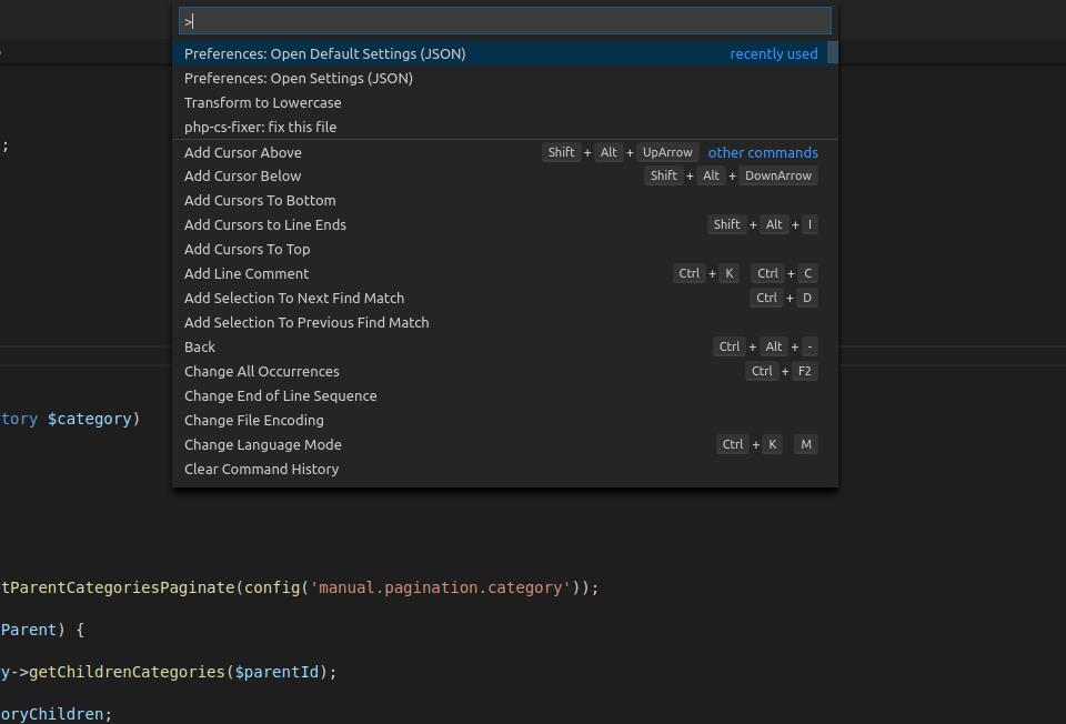 Để mở Command Palette , bạn cần gõ tổ hợp phím Ctrl + Shift + P, tiếp đến bạn có thể gõ những keywords cần thiết để tìm kiếm commands danh sách commands.