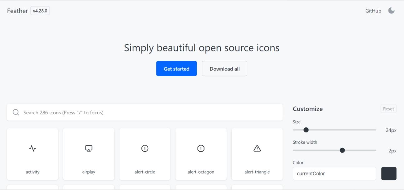 Feather cung cấp khoảng hơn ~280 icons, rất nhẹ nhàng, đơn giản và nhất quán. Hiện tại bộ icons này nhận được khoảng 20.3k stars trên Github.
