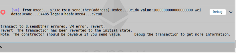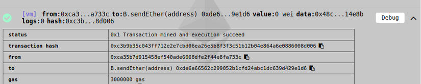 Cùng thử gửi ether cho contract A thông qua hàm sendEther của B bằng cách truyền đối số là địa chỉ của A, và cùng xem kết quả có vẻ vẫn không khả quan lắm: