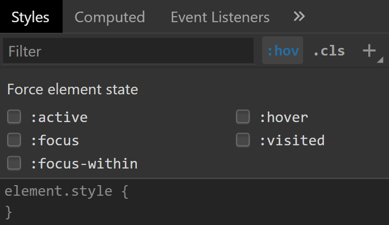 Chrome dev tools cho thấy một cách hay để khóa trạng thái của một phần tử, do đó bạn có thể sử dụng các thuộc tính của nó. Bằng cách này, bạn có thể nhanh chóng chuyển đổi một phần tử :active, :hover, :focus, :focus-within và :visited: