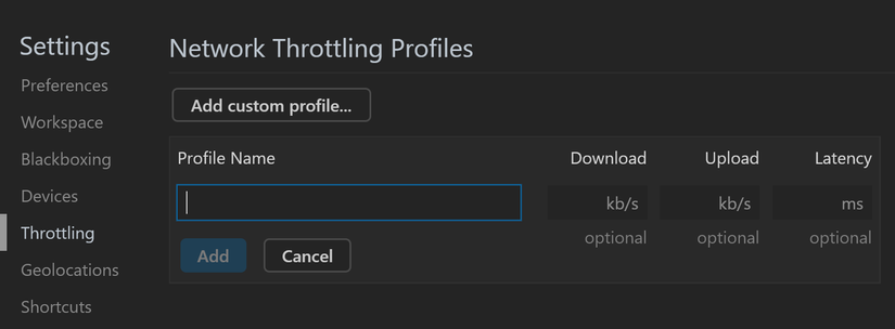 Bên cạnh online, còn có một vài cài đặt sẵn khác: Fast 3G, Slow 3G và offline, khác nhau về tốc độ tải lên, tốc độ tải xuống và độ trễ. Nếu bạn cần mô phỏng một tốc độ khác lạ hơn, bạn có thể thêm hồ sơ của riêng mình thông qua nút Add ...