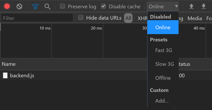 Sử dụng tab Network, chúng ta có thể kiểm tra trang web của mình ở nhiều tốc độ internet khác nhau. Giá trị đặt trước mặc định là online và bạn sẽ tận hưởng toàn bộ băng thông kết nối internet của mình.