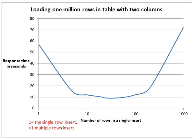 Trong hình 1 chúng ta có thể thấy, insert hoạt động tốt nhất tại khoảng 25 record / lần insert. Hình 2 cho ta thấy trong cùng 1 tập dữ liệu là 1 triệu records thì single insert mất khoảng 57 seconds để load xong , còn mới multiple insert với 25 records / lần insert sẽ rút ngắn thời gian chỉ còn khoảng 9 seconds.