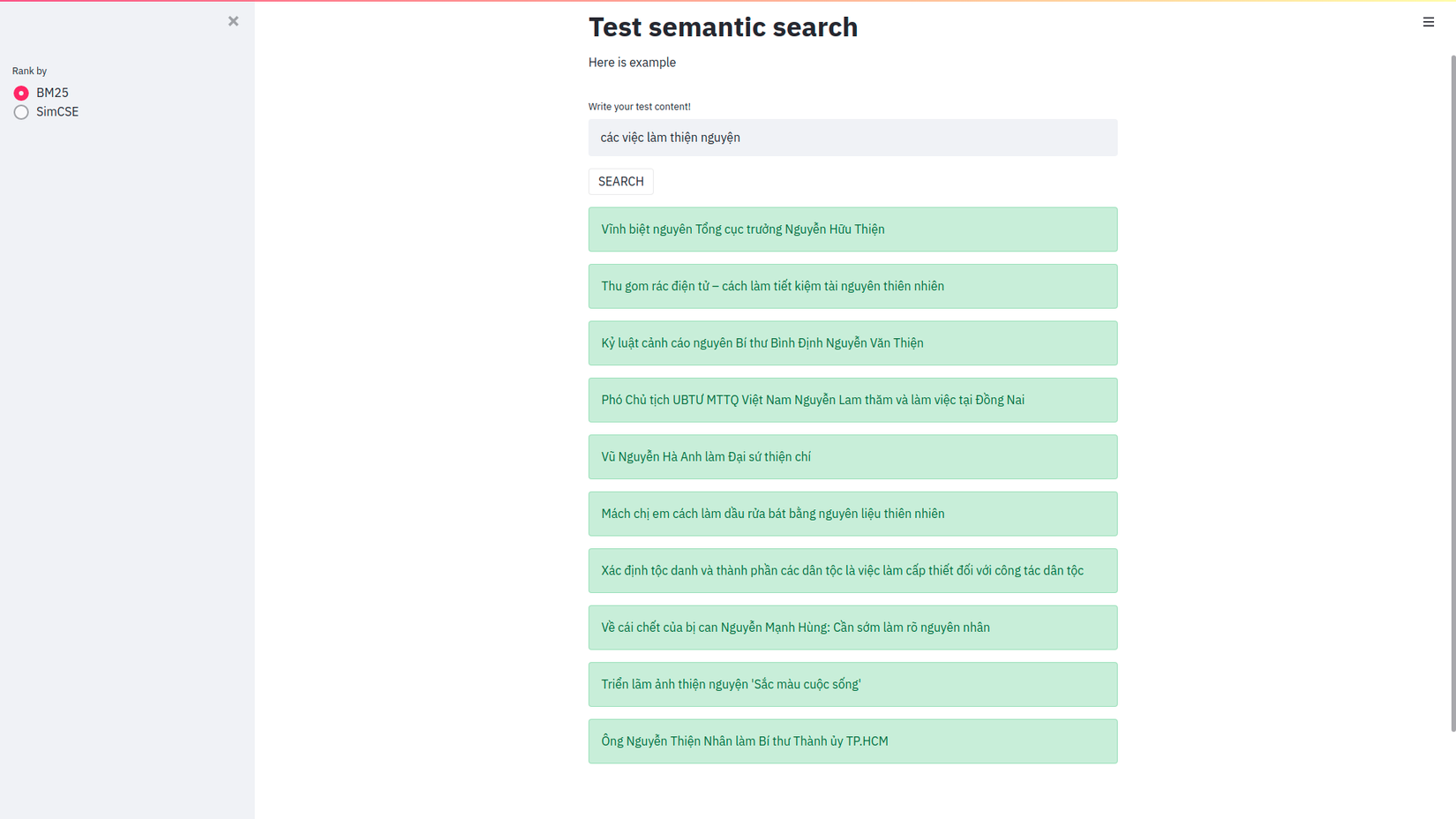 Mình sử dụng thêm streamlit để demo cũng như so sánh kết quả khi search bằng elasticsearch bình thường (BM25) và cách search theo độ tương đồng giữa các vector embedding (SimCSE). Các bạn cùng xem kết quả nhé.!!!!