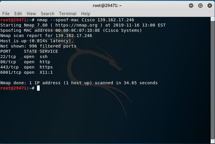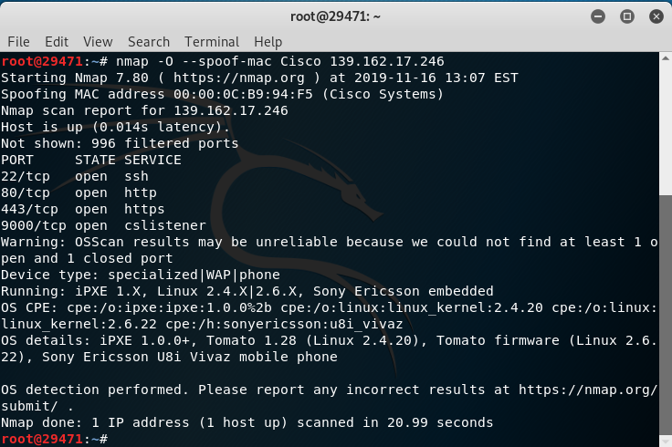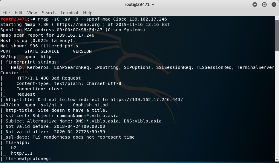 Cùng tổng hợp 1 số đối số để có cái nhìn toàn diện, tôi sẽ dùng lệnh #nmap -sC -sV -O -spoof-mac Cisco 139.162.17.246
