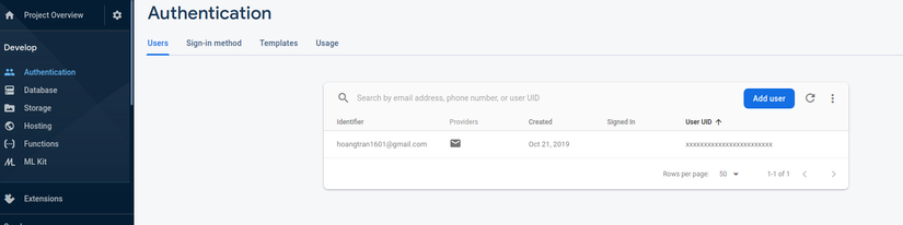 Check thử trên Firebase console, đã thấy tạo user thành công