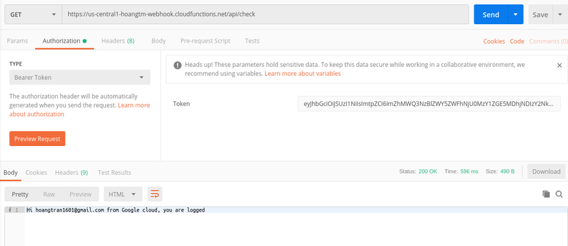 - Nếu đã đăng nhập, sẽ có string Hi xxx@yyyy.zzz from Google cloud, you are logged