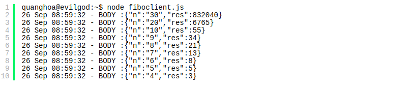 Chúng ta chạy file này, sau đó bạn có thể vào trình duyệt và gõ đường dẫn localhost:3002/fibonacci/<tham số> với tham số là một số nguyên bất kỳ, server sẽ trả về chuỗi JSON kết quả là số fibonacci cho bạn.