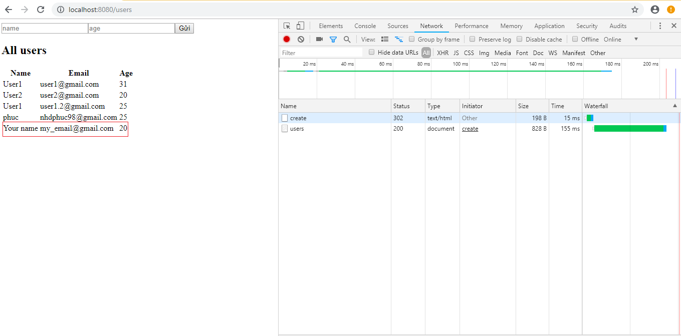 Cũng lưu ý rằng, hiện tại, chúng ta đang lưu trữ thông tin các user trong một array javascript, do đó khi F5 lại trang, ta sẽ mất đi những user được tạo động, chỉ bao gồm các user tĩnh mà ta đã thêm vào ở mã nguồn. Trong thực tế, ta sẽ lưu vào database. Phần này mình sẽ hướng dẫn các bạn trong các bài sau