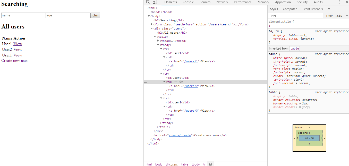 Bây giờ, ta sẽ điều chỉnh mã HTML, để ở trang index của users, ta chỉ hiển thị tên của user đó. Sau đó, tạo một link dẫn đến trang xem chi tiết thông tin, mình sẽ gọi là trang show